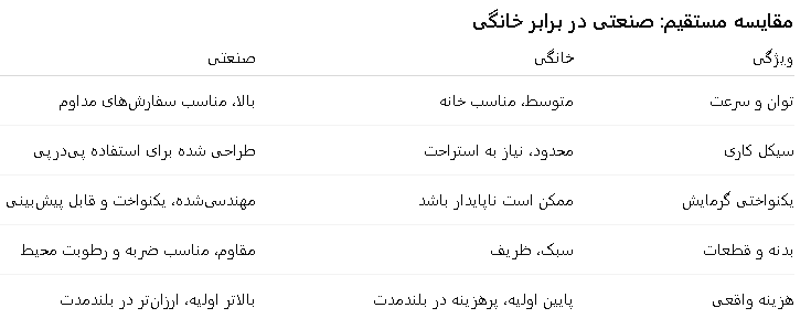اقتصاد دستگاه صنعتی هم متفاوت است: قیمت اولیه بالاتر، اما هزینه واقعی کمتر است؛ خرابی کمتر، عمر طولانیتر، کیفیت ثابتتر و توقف کاری کمتر.